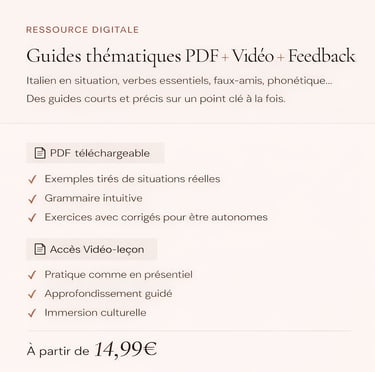 Sur YouTube, je publie chaque semaine des vidéos concrètes pour apprendre l'italien naturellement. Vocabulaire, expressions, situations réelles, sans jargon inutile.