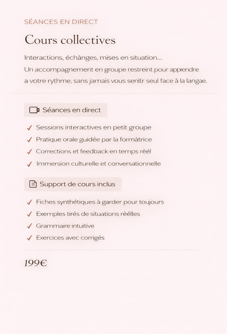 Ressources digitales en autonomie ou programme intensif en groupe, chaque format est pensé pour vous faire progresser à votre rythme et selon vos objectifs.