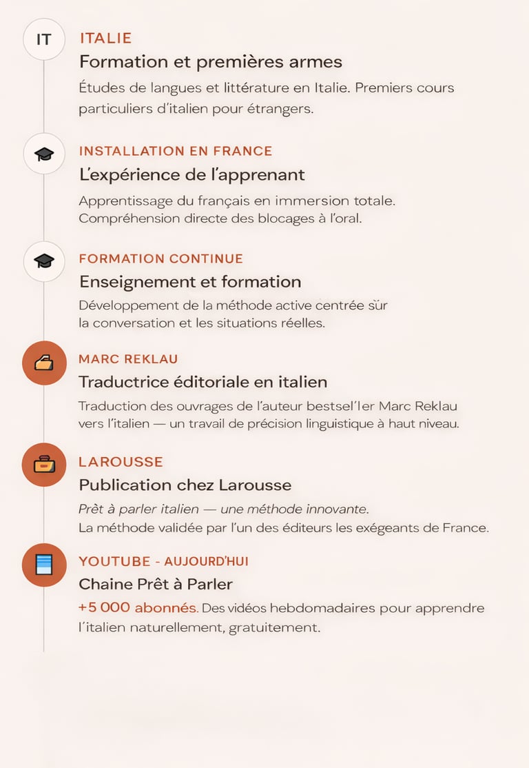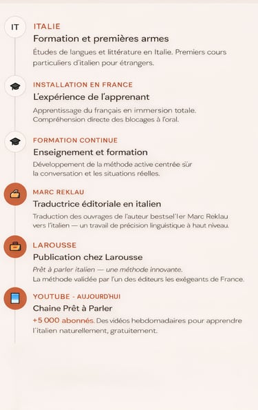 Cette double casquette — formatrice et traductrice — me donne une lecture de l'italien à la fois pédagogique et professionnelle. Ce n'est pas seulement une langue que j'enseigne. C'est une langue que je pratique au quotidien.